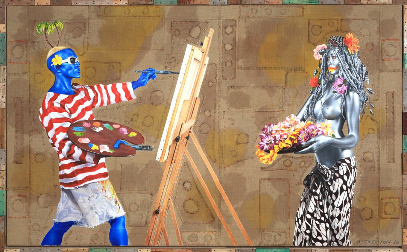 Farcical portrayal: Ashley Bickerton, 'Sanur beach after Le Mayeur & Ni Pollok' (mixed media on jute, 2014). Bickerton is among the renowned expatriate artists who live on Bali whose work has entered the collections of the Museum of Modern Art and the Guggenheim Museum in New York, as well as the Tate Gallery in London. (Courtesy of Gajah Gallery/-)