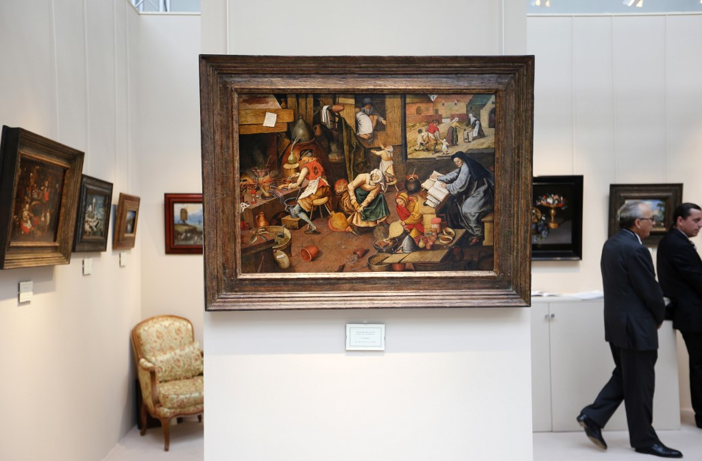 Visitors walk past a painting by Flemish painter Pieter Brueghel the Younger entitled 'L'Alchimiste' and displayed on an exhibition stand during the 26th edition of the 'Biennale des antiquaires' (the antique dealers biennial fair) on September 13, 2012 at the Grand Palais in Paris. (AFP/Francois Guillot)
