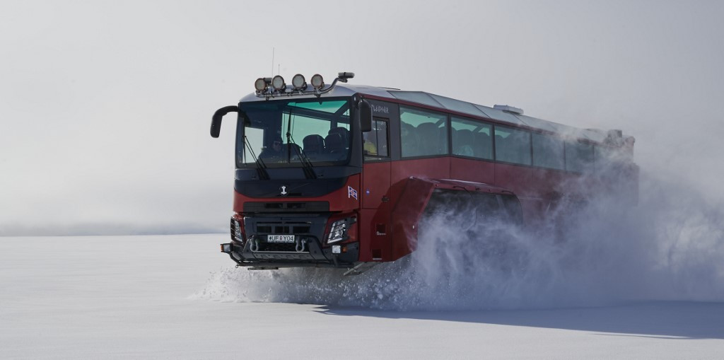 The red glacier mega bus is 15 meters long and fitted with massive tires for traction across the powder snow of western Iceland's vast Langjokull ice cap.