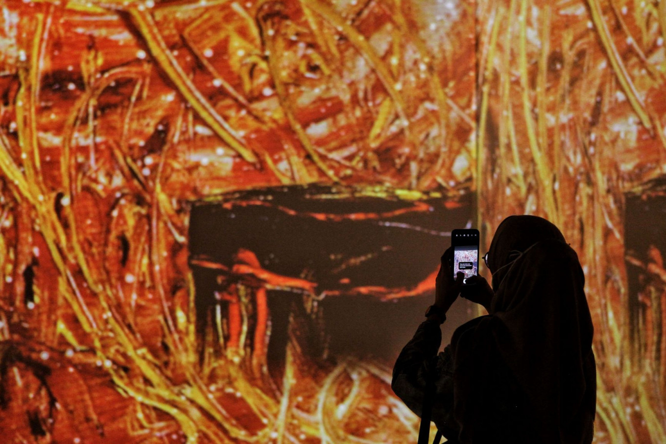 Immersive: Along with video projections, several of Affandi’s paintings from the gallery's own collection are also displayed. (JP/Seto Wardhana)Along with video-mapped paintings, the exhibition also features 15 of Affandi works from the National Gallery’s own collection, which spans three decades from the 1940s to the 1970s.