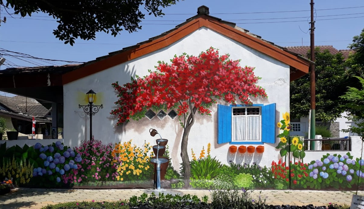 The self-taught artist has created a mural of a garden scene filled with flowers on the side of a local integrated health services post (Posyandu), her own way of beautifying the space and inspiring locals who often visit the location to work out.