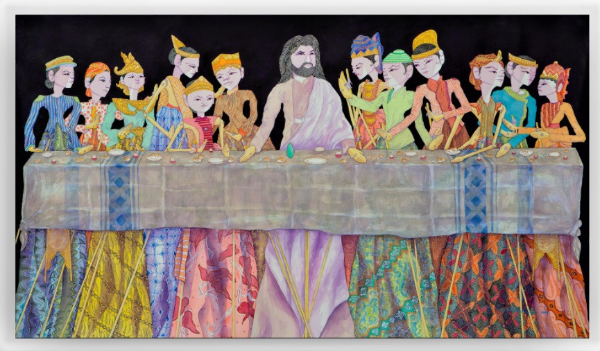 Sasya reimagined the final meal shared by Jesus and his disciples in Jerusalem in a painting that features wayang golek (wooden wayang puppets) as the disciples, adorned in batik with different motifs.