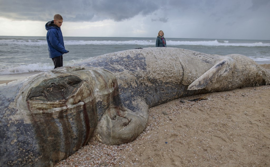 People gather around a dead fin whale that washed ashore on a beach in the southern Israeli city of Ashkelon on February 19, 2021. The rare appearance of the dead whale, discovered on February 18, at the southern Nitzanim beach near Ashkelon, was initially thought to have been connected to the tar pollution, which killed many marine animals. But Israel's Nature and Parks Authority said on Friday that experts determined the whale, a 16.9 metre male weighing an estimated 25 tonnes, was in an advanced state of decay, meaning it had died some two weeks ago. (Agence France Presse/Ahmad Gharabli)