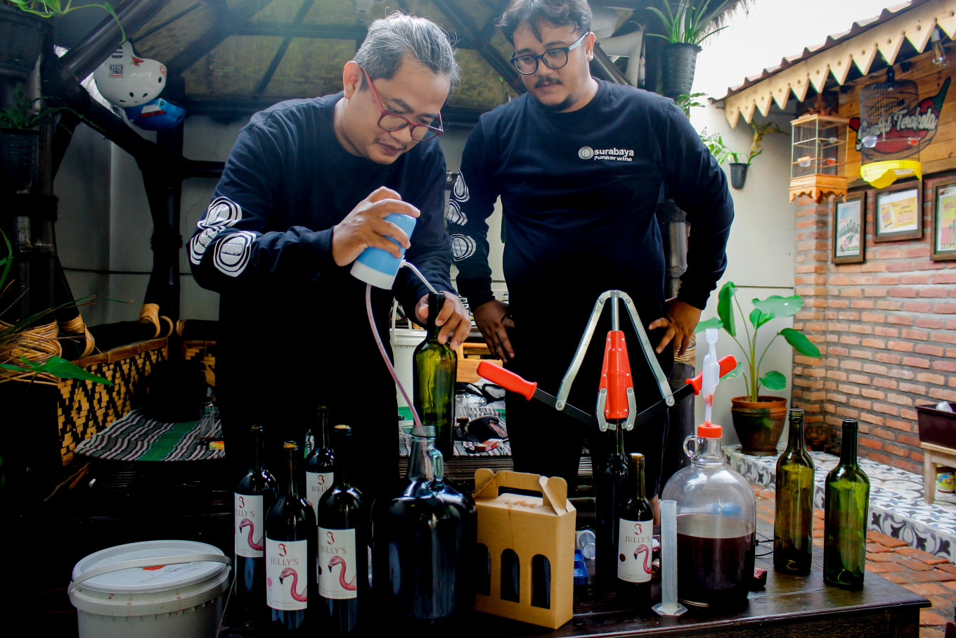 The bespectacled man is Arief Kurniawan. Friends call him “Plats”, which he prefers. In the afternoon The Jakarta Post met with him, it was time for the 41-year-old to bottle his fermented wine. For the past four years, Plats has kept busy exploring the fermentation process of homemade wine.