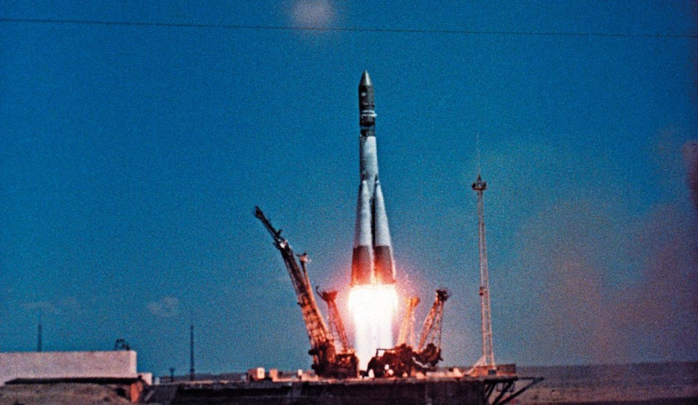 In this file photo taken on April 12, 1961 The Vostok-1 spaceship blasts off on top of Rocket R-7 from the Baikonur space center with Soviet cosmonaut Yuri Gagarin on board for the first manned trip into space. Sixty years ago Monday Soviet cosmonaut Yuri Gagarin became the first person in space, securing victory for Moscow in its race with Washington and marking a new chapter in the history of space exploration. (AFP/Ria Novosti)