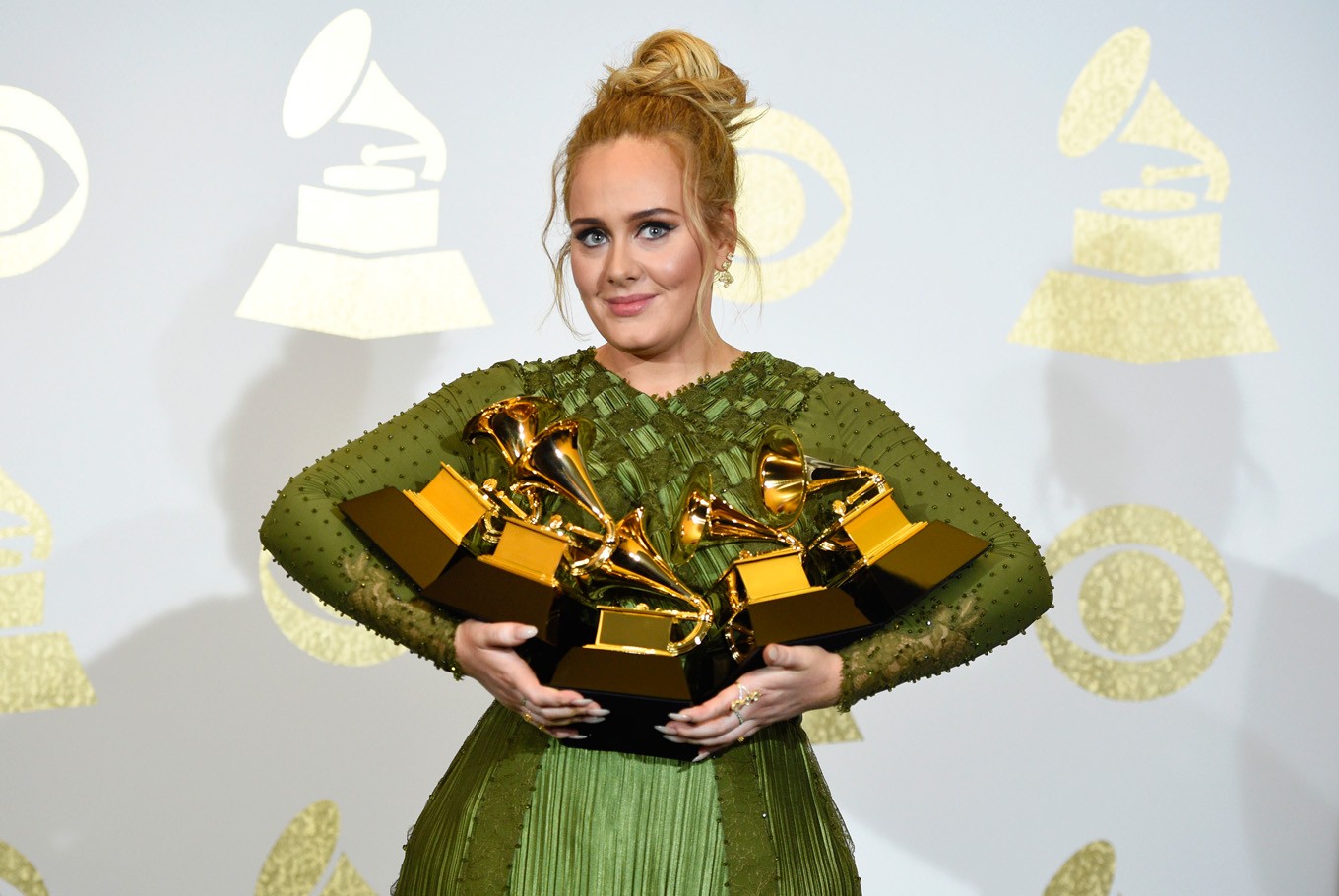 Adele poses in the press room with the awards for album of the year for "25", song of the year for "Hello", record of the year for "Hello", best pop solo performance for "Hello", and best pop vocal album for "25" at the 59th annual Grammy Awards at the Staples Center on Sunday, Feb. 12, 2017, in Los Angeles. (Chris Pizzello/Invision/AP/File)