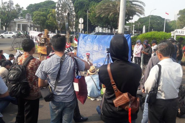 On Tuesday, local authorities, including from the Jakarta Public Order Agency (Satpol PP), planned to tear down a tarpaulin tent erected by the farmers across from the State Palace in Central Jakarta, kompas.com reported.
