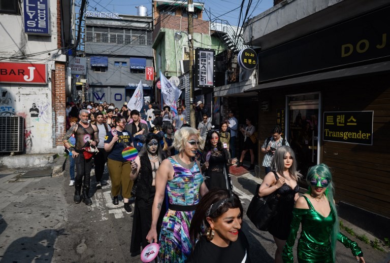 In a photo taken on May 26 participants of the 'Seoul Drag Parade' march in the Itaewon district of Seoul. South Korea held its first ever drag parade this weekend, a small but significant step for rights activists in a country that remains deeply conservative when it comes to gender and sexuality. (AFP/Ed Jones)