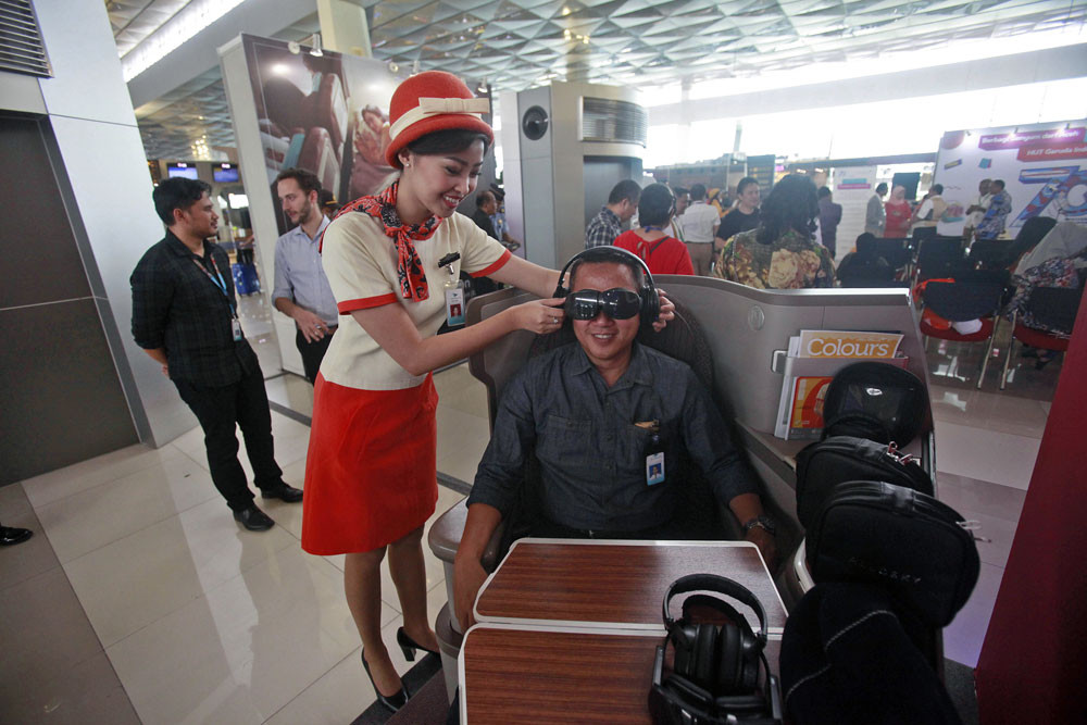 A stewardess helps a passenger try out a virtual reality (VR) device during an event to commemorate the 70th anniversary of national flag carrier Garuda Indonesia at Soekarno-Hatta International Airport in Tangerang, Banten, on Jan. 26. The airline's revised financial report showed a net loss of US$175.02 million after reporting a net profit of $5.01 million in the previous report. (The Jakarta Post/Iqbal Yuwansyah)