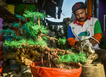 Nobody would be able to tell that dozens of colorful flower pots and a trash cans in front of a house in Torongrejo in Batu, East Java, are made of used diapers.