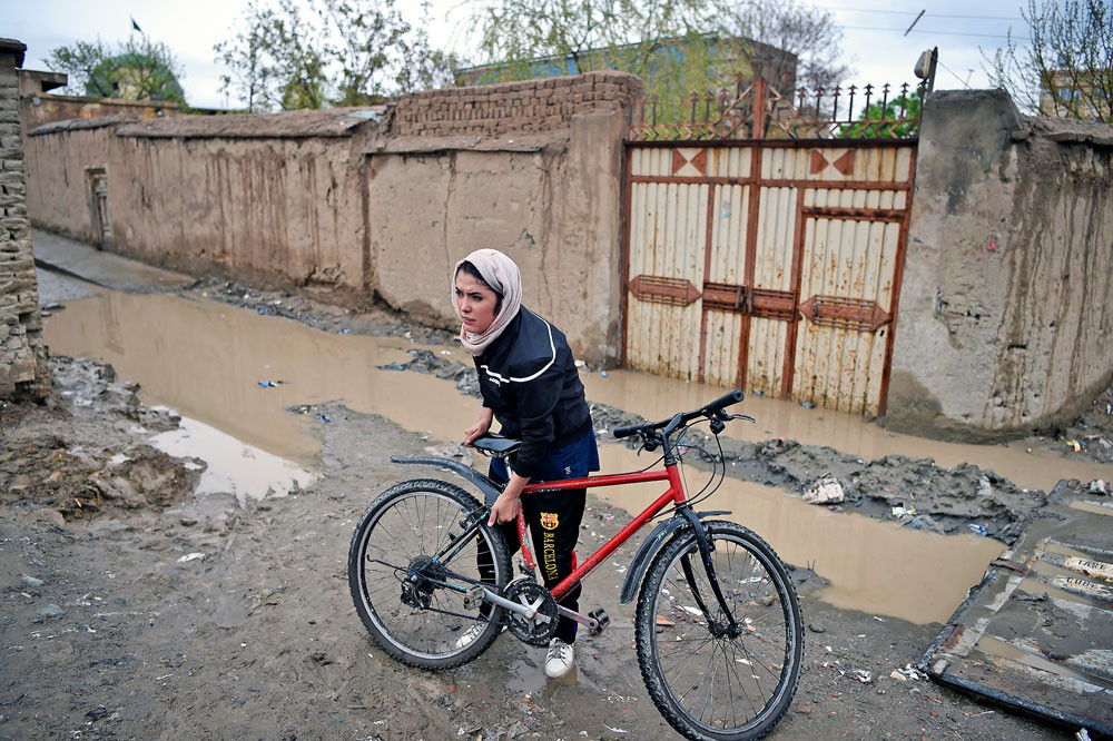 A life of freedom: In this photo taken on April 14, Afghan cyclist Kobra Samim adjusts her bicycle on a street in Kabul. Across Afghanistan, women have taken to social media to join a campaign dubbed #MyRedLine that aims to pressure the government, the Taliban and the United States into ensuring women’s hard-won advancements are not tossed aside in the rush for a peace accord.