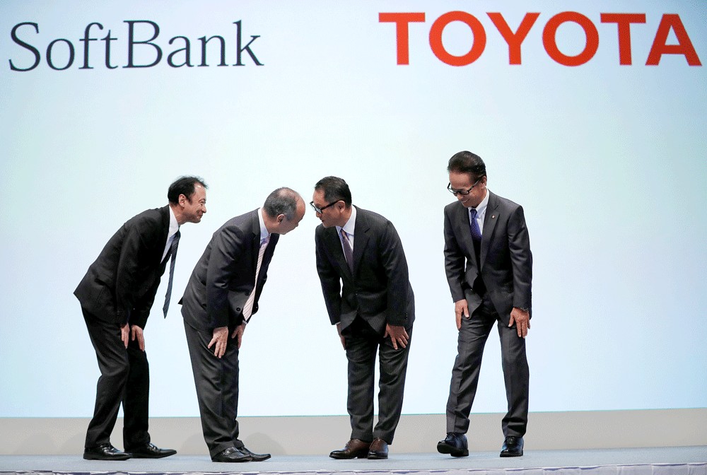 Bowing down: Toyota Motor Corp president Akio Toyoda (second right) and executive vice president Shigeki Tomoyama (right) bow with SoftBank Group Corp chairman and CEO Masayoshi Son (second left) and SoftBank Corp representative director and chief technology officer Junichi Miyakawa during their joint news conference in Tokyo on Thursday. (Reuters/Issei Kato)