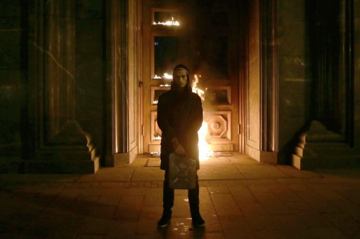 In this file photo taken on early November 09, 2015 Russian artist Pyotr Pavlensky poses after setting fire to the doors of the headquarters of the FSB security service, the successor to the KGB, in central Moscow. Emmanuel Macron's candidate for Paris mayor, Benjamin Griveaux, withdrew from the race over a leaked sex video on February 13, in a blow for the French president's party ahead of March local elections. Griveaux said he opted for retreat to protect his family after a website published video excerpts of a man masturbating, accompanied by screengrabs of racy text messages, which it said came from the former government spokesman. On February 14, the Russian performance artist Pyotr Pavlensky confirmed, in an AFP interview in the office of his lawyer Juan Branco, that he was responsible for publishing the video online.