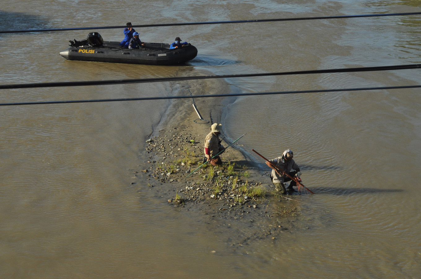 Officers are waiting for a wild crocodile caught in a motorcycle tire to surface in the Palu River in Palu, Central Sulawesi, Thursday (02/06/2020). The rescue operation was carried out by the Central Sulawesi Natural Resources Conservation Agency (BKSDA), NTT BKSDA, Central Sulawesi Regional Police, and officers from the Ministry of Environment and Forestry (KLHK). (Antara/Mohamad Hamzah)