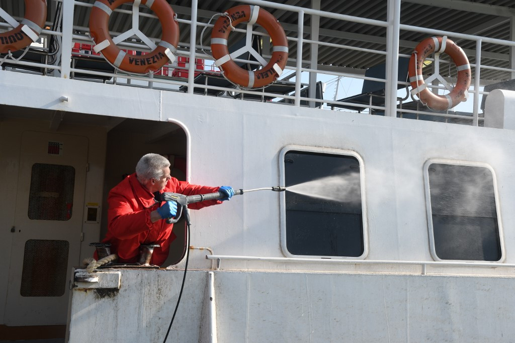 A member of sanitation services sanitises a vaporetto public waterbus in Venice on February 26, 2020, after the COVID-19 outbreak has spread to northern Italy. - Italy saw a fresh jump in the number of cases of the new coronavirus on February 26, with another death also reported to bring the total to 12 and 374 infections. The novel coronavirus has killed more than 2,600 people worldwide and infected almost 80,000 others, since its emergence in central China last month. (AFP/ANDREA PATTARO)