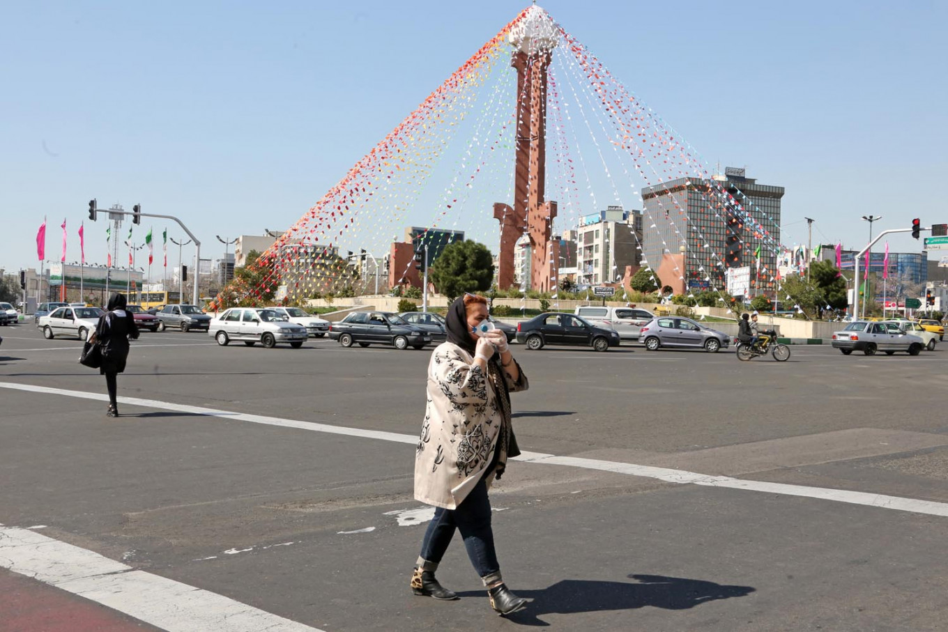 An Iranian pedestrian crosses a street while wearing a protective mask in Tehran on March 10, 2020 amid the spread of coronavirus in the country. Iran today reported 54 new deaths from the novel coronavirus in the past 24 hours, the highest single-day toll since the start of the country's outbreak. (AFP/Atta Kenare)