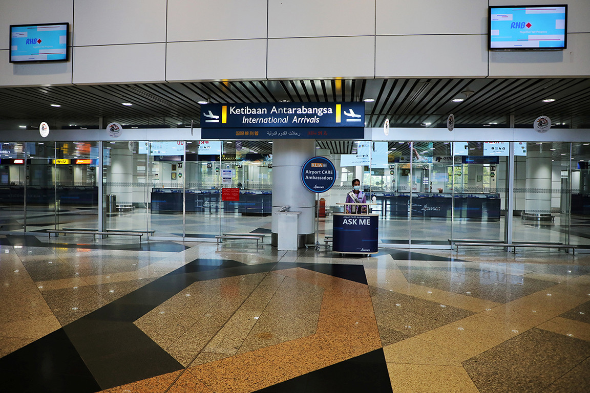 An airport care ambassador wearing protective mask, waits for passengers at the empty international arrival hall after Malaysia’s government closed its borders due to the spread of the coronavirus disease (COVID-19), at Kuala Lumpur International Airport in Sepang, Malaysia March 18, 2020. (REUTERS/Lim Huey Teng)