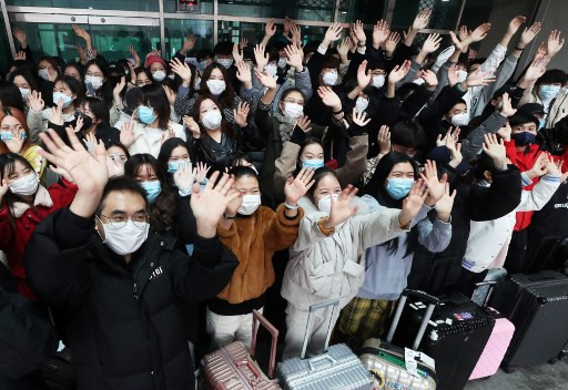 Chinese students who had been quarantined for two weeks after arriving in South Korea, amid concerns of the COVID-19 coronavirus, celebrate their release from a temporary living facility in Yongin on March 10, 2020. Chinese students flying home from overseas to escape the coronavirus pandemic face a frosty reception from sections of the public who view them as wealthy, spoiled -- and potentially contaminated. (Yonhap via AFP/-)