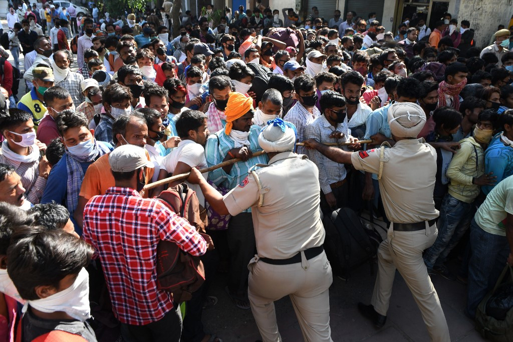 Policemen push back stranded migrant workers as they gather for a medical screening before taking a train to Sultanpur in Uttar Pradesh state to return to their hometowns after the government eased a nationwide lockdown imposed as a preventive measure against the COVID-19, in Amritsar, India on Wednesday, 2020. India registered some 6,000 new cases of the novel coronavirus on Friday, the country's biggest jump in 24 hours, as New Delhi eases a nationwide lockdown and airlines prepare to resume some domestic flights.