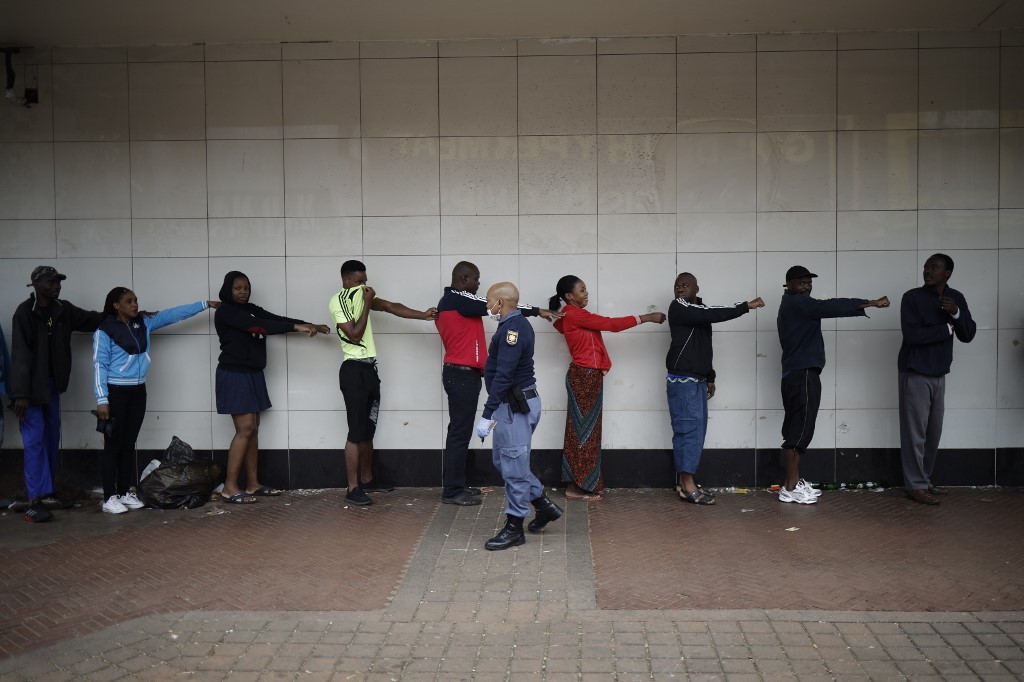 A member of the South African Police Service (SAPS) enforces social distancing as he makes shoppers hold their hands out in front of them to ensure that they are at least one metre apart from one another while they queue outside a supermarket in Yeoville, Johannesburg, on March 28, 2020.South Africa's churches and other places of worship can reopen their doors from June, but will be limited to 50 people. (AFP/Marco LONGARI)