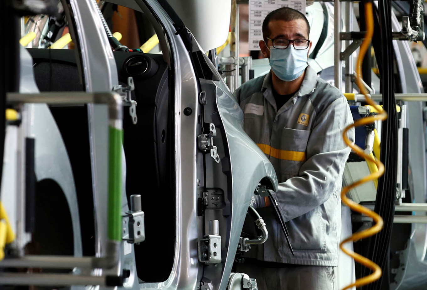 An employee, wearing a protective face mask, works on the automobile assembly line of Renault ZOE cars at the Renault automobile factory in Flins, France, on May 6. The French auto giant plans to cut around 15,000 jobs worldwide, including 4,600 in France, as part of a two billion euro cost-cutting plan over three years, sources said Thursday. (REUTERS/Gonzalo Fuentes)