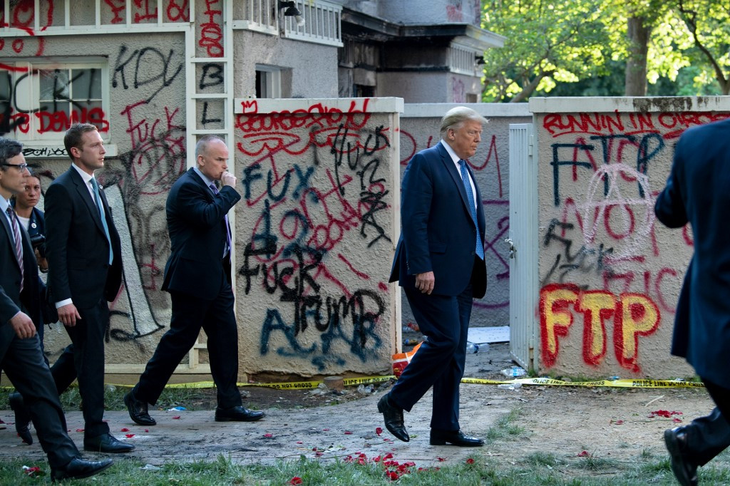 US President Donald Trump walks back to the White House escorted by the Secret Service after appearing outside of St John's Episcopal church across Lafayette Park in Washington, DC on Monday. Trump said on Tuesday the Republican National Convention set for August in North Carolina would have to be held in another state because of social distancing restrictions ordered by the state's governor. (Agence France Presse/Brendan Smialowski)