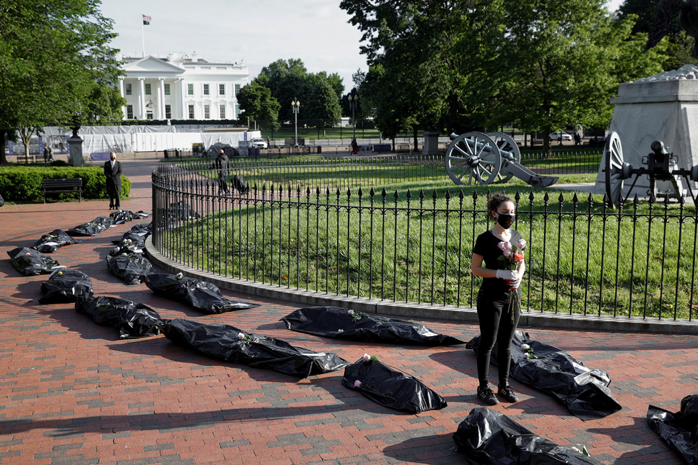 Margot Bloch stands beside a line of mock body bags while holding flowers during a funeral procession demonstration for the COVID-19 victims outside of the White House in Washington, US on May 20, 2020.University of Washington researchers estimated on Monday that 145,728 people could die of COVID-19 in the United States by August, raising their grim forecast by more than 5,000 fatalities in a matter of days. (REUTERS/Tom Brenner )