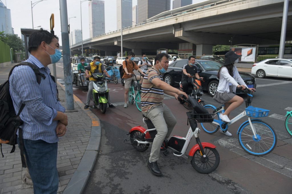 People wear masks as they wait at an intersection in Beijing on June 28, 2020. Beijing has partially lifted a weeks-long lockdown imposed in the Chinese capital to head off a feared second wave of coronavirus infections after three million samples were taken in two weeks, officials said. (AFP/GREG BAKER )