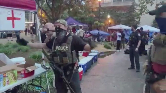 A police officer, wearing a tactical vest, gestures for people to step back after a fatal shooting at Jefferson Square Park, in Louisville, Kentucky, US, on Saturday in this still image obtained from social media video. Protesters have camped out at the park to demonstrate against the police killing of Breonna Taylor, a Black woman, in her home in March. Content filmed June 27, 2020. (Maxwell Mitchell/REUTERS /Maxwell Mitchell )