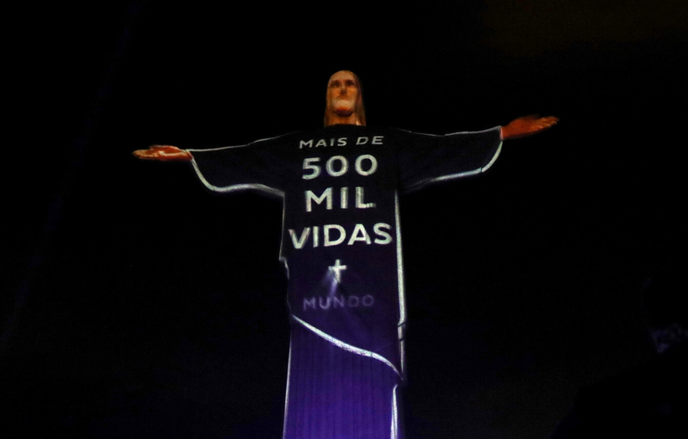 The Christ the Redeemer statue is lit up with a message that reads 'More than 500 thousand lives world' as a tribute to COVID-19 victims in Rio de Janeiro, Brazil on Wednesday.Brazil surpassed 60,000 coronavirus deaths on Wednesday, the Ministry of Health said, citing a recent wave of contamination in Southern and Midwestern areas of the country. (REUTERS/Pilar Olivares)
