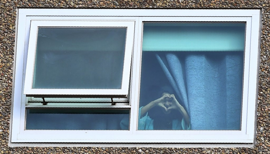 A resident gestures from a window at one of nine public housing estates locked down due a spike in COVID-19 coronavirus numbers in Melbourne on Monday. Australia will likely slow down the return of its citizens from abroad, Prime Minister Scott Morrison said on Wednesday, as it grapples with a fresh outbreak of the coronavirus that has led it to isolate its second most populous state. (AFP/William WEST )
