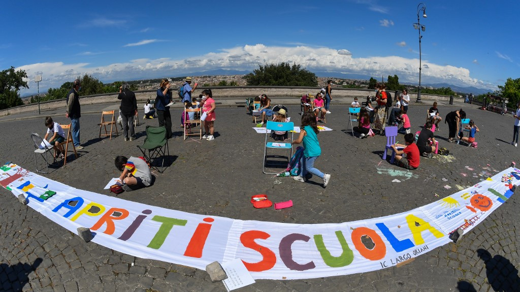 Parents and children from Rome's public primary and secondary school IC Largo Oriani take part in a flashmob entitled "Open School' (Apriti Scoula) at the Gianicolo Belvedere overlooking Rome on June 8 to mark the end of their unusual school year as the country eases its lockdown aimed at curbing the spread of COVID-19 infection. (AFP/Andreas SOLARO )