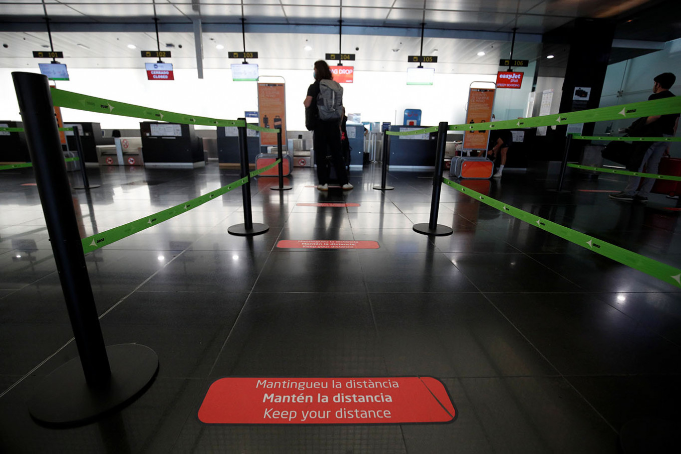 Travellers queue at an EasyJet check-in desk at Josep Tarradellas Barcelona-El Prat airport, amid the spread of the COVID-19, in Barcelona, Spain, July 26, 2020.After Britain's quarantine move and a travel warning from France, Germany became the latest country to advise Tuesday against holidays in parts of Spain with a surge in virus cases. (REUTERS/Albert Gea)