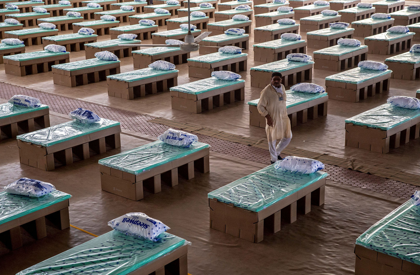 A volunteer walks past disposable beds made out of cardboard at the campus of Radha Soami Satsang Beas, a spiritual organization, where a coronavirus disease (COVID-19) care centre has been constructed for the patients amidst the spread of the disease, in New Delhi, India, June 26, 2020.WHO Director-General Tedros Adhanom Ghebreyesus and WHO emergencies head Mike Ryan exhorted nations to rigorously enforce health measures such as mask-wearing, social distancing, hand-washing and testing. (REUTERS/Danish Siddiqui )