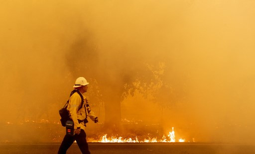 A Pacific Gas and Electric firefighter walks down a road as flames approach in Fairfield, California during the LNU Lightning Complex fire on Wednesday. - Thousands of people fled their homes in northern California on August 19 as hundreds of fast-moving wildfires spread across the region, burning houses and leading to the death of a helicopter pilot. (AFP/Josh Edelson )