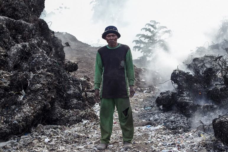 Sixty-year-old waste collector Puji Urip stands in front of burning plastic waste at an imported plastic dumpsite at Bangun village in Mojokerto, East Java on Dec. 4, 2018. Several top food and beverages companies are teaming up to improve their recycling efforts and reduce the waste they produce that pollutes Indonesia's waters. (-/Fulli S. Handoko)