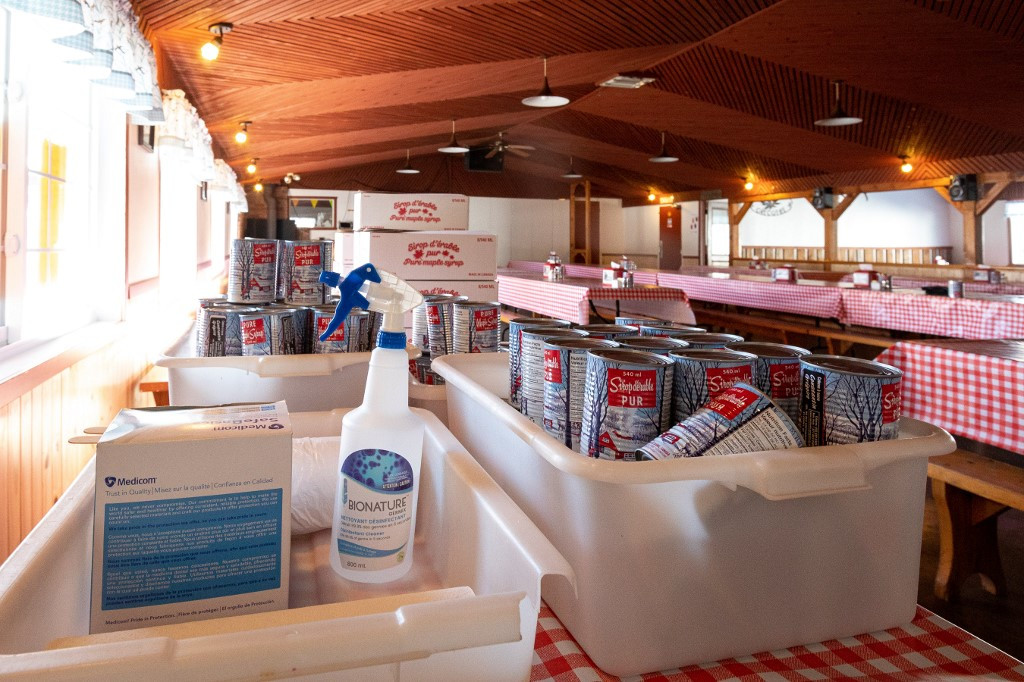 Some ready-to-sell cans of maple syrup are seen by disinfectant products in an empty restaurant at the Constantin Gregoire Sugar shack in Saint-Esprit, Quebec on March 31, 2020.Quebec on Monday ordered new restrictions on bars and restaurants in coronavirus hot spots, while Ontario's premier warned of a "more complex" second wave, as Canada's two most-populous provinces saw big increases in COVID-19 cases. (AFP/Benedicte Brocard)