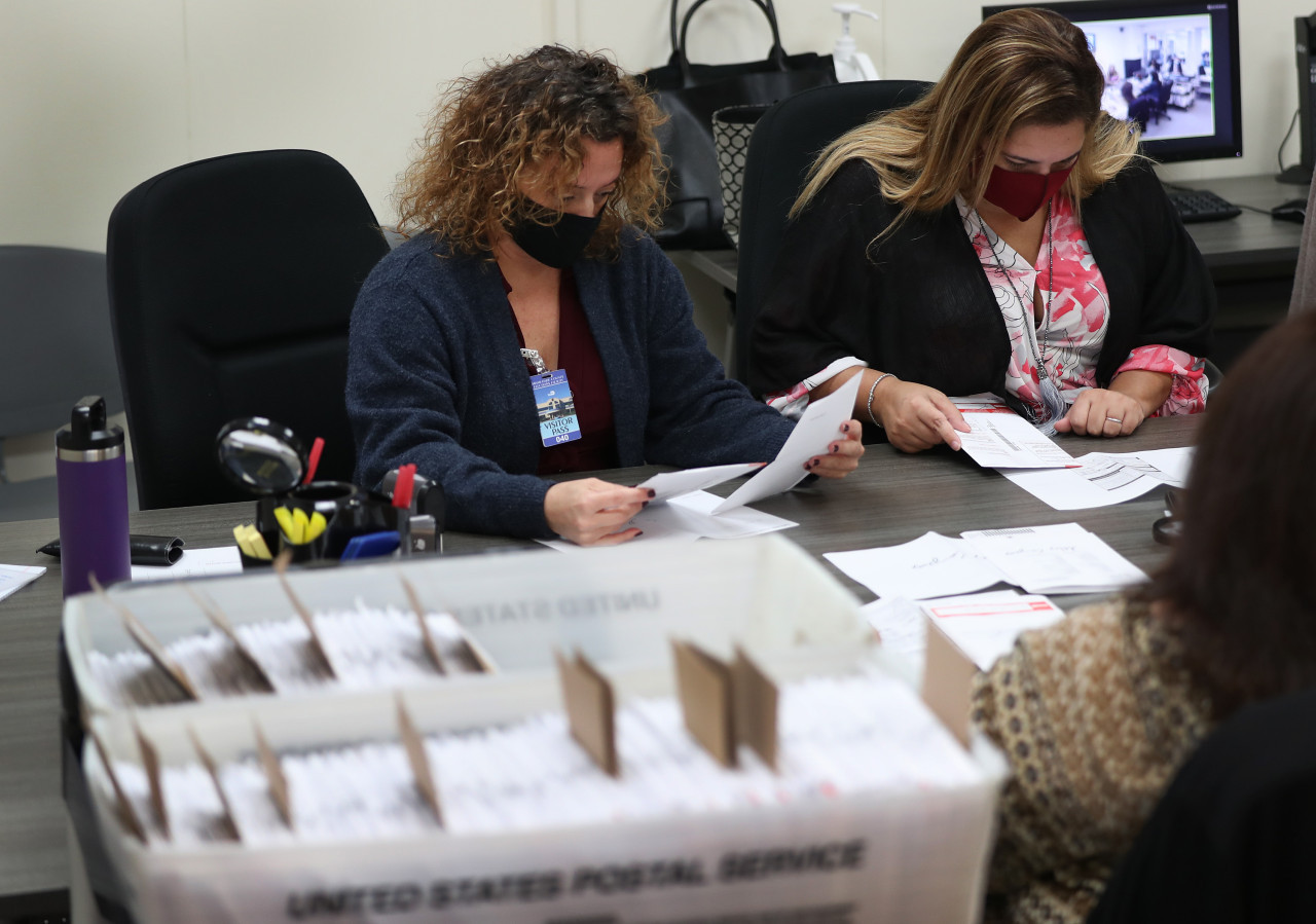 Milena Abreu, County Judge, (left) and Victoria Ferrer, County Judge, (right) inspect Vote-by-Mail ballots for valid signatures as Miami-Dade County Canvassing Board convenes ahead of the November 3rd general election at the Miami-Dade County Elections Department on Thursday in Doral, Florida. The canvassing board was verifying questionable voter’s signatures on the Vote-by-Mail ballots by comparing them to the signature on file. Voters have cast 149,683 Vote-by-Mail ballots so far and only 414 of those had been questioned. Voters head to the polls in Florida on October 19th for early in person voting for the November 3rd election where President Donald Trump and Democratic presidential candidate Joe Biden are facing off against each other. (Getty Images via AFP/Joe Raedle)