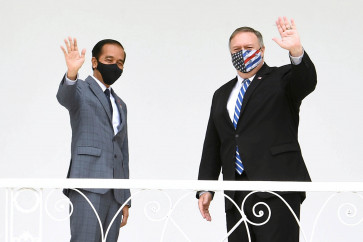 Indonesian President Joko "Jokowi" Widodo and US Secretary of State Mike Pompeo wave during their meeting at the Presidential Palace in Bogor, Indonesia, Oct. 29. On Oct. 22 Indonesia signed the Geneva Consensus Declaration on Promoting Women's Health and Strengthening the Family during a virtual ceremony cohosted by Pompeo and US Secretary of Health and Human Services Alex Azar. ( Indonesian Presidential Palace/Rusman)