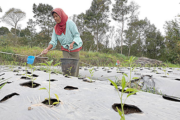 Hot commodity: A woman waters chili plants at a farm on the slopes of Mount Merapi in Selo, Boyolali regency, Central Java, on Wednesday. In addition to accommodating new resorts to boost tourism, the hilly areas near Merapi are also being turned into farmland to support the local economy. (JP/R. Berto Wedhatama)
