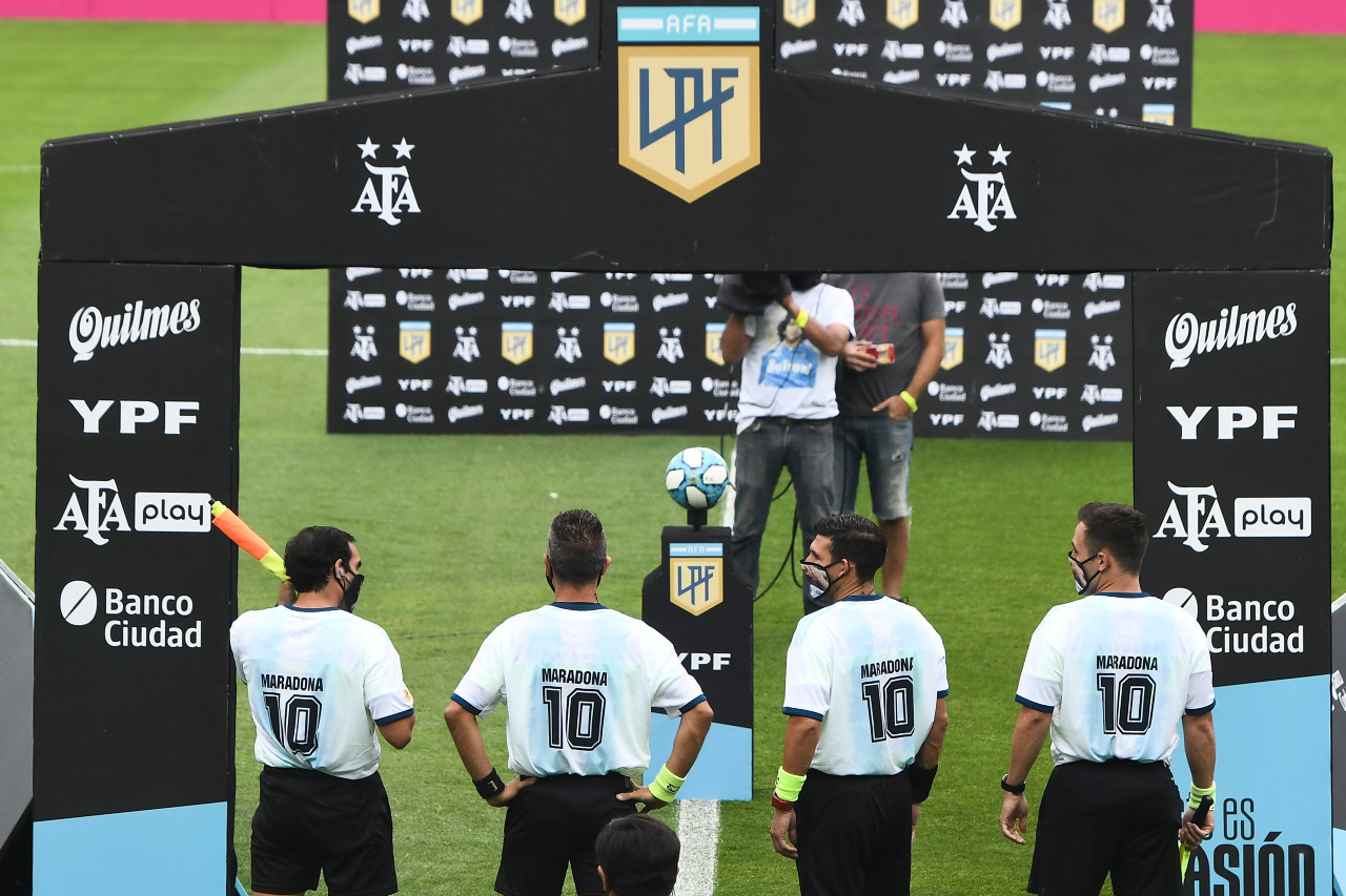 Referees enter the field wearing a special jersey with the colors of Argentina and a logo of Maradona to pay homage to the late Argentine football legend before a Copa Diego Maradona 2020 soccer match between Racing Club and Union at the Presidente Peron Stadium in Avellaneda, Buenos Aires province, Argentina, on Saturday. (AFP/Rodrigo Valle)