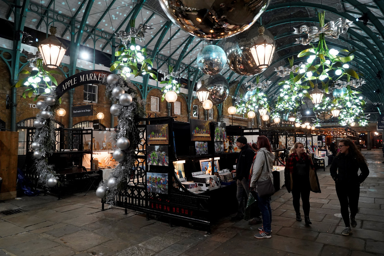 Pedestrians walk past shops and stalls inside the Covent Garden Apple Market in London on Wednesday as England emerges from a month-long lockdown to combat the spread of COVID-19. England on Wednesday exited a month-long lockdown into a new 3-tiered system of curbs with non-essential retail, leisure centers and salons all reopening but with some sectors, including hospitality, seeing tighter restrictions.