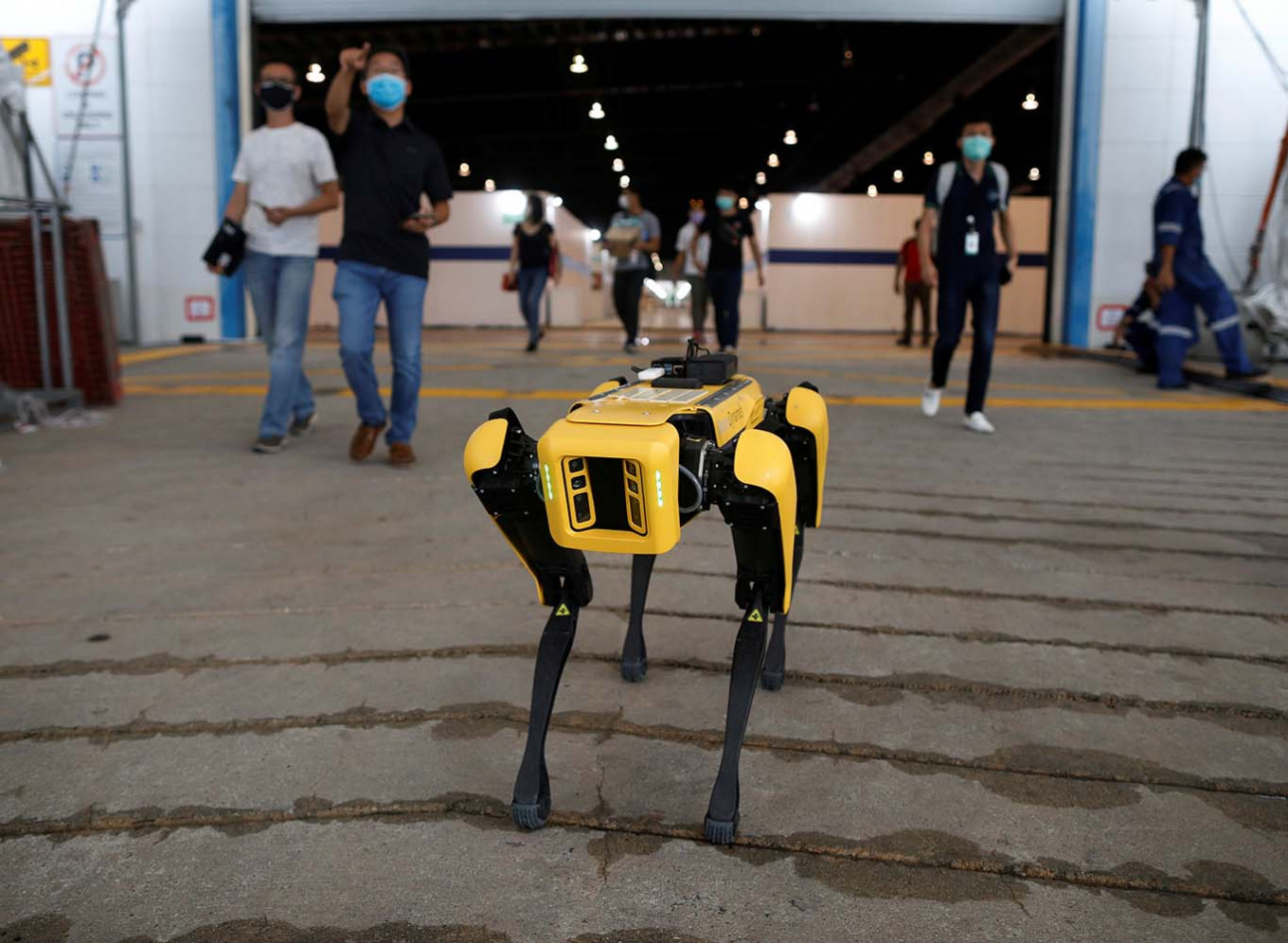 SPOT, a four-legged robot developed by Boston Dynamics undergoes further testing to deliver medicine to patients, at Changi Exhibition Centre which has been repurposed into a community isolation facility that will house recovering or early COVID-19 patients with mild symptoms, during the coronavirus outbreak in Singapore April 24, 2020. Picture taken April 24, 2020. (REUTERS/Edgar Su)