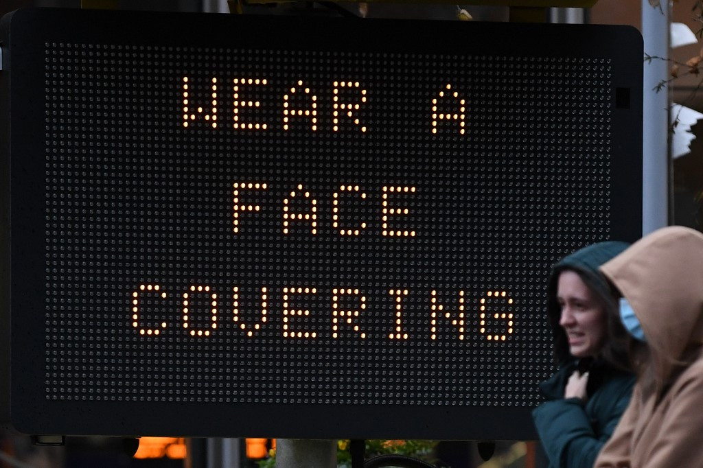 Pedestrians walk past an electronic sign that advises people to wear a face covering because of the coronavirus pandemic in London on December 16, 2020. - London on Wednesday moved into the highest level of coronavirus restrictions in an effort to control rising infection rates, dealing another blow to hospitality venues before Christmas. The British capital's move into (AFP/DANIEL LEAL-OLIVAS )
