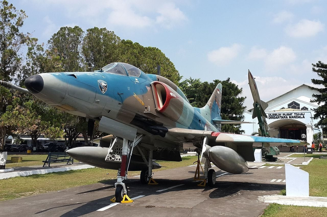 An example of an A-4E Skyhawk from the 12th Squadron now stands as a monument at its former home base, Roesmin Nurjadin Air Force Base in Pekanbaru. (www.tni-au.mil.id/-)As the C-27 Sabres were nearing the end of their service, Indonesia was looking for other sources to modernize its jet fighters and made a deal with an unexpected country. Indonesia also needed supersonic jet fighters to resurrect its dormant squadrons after cutting all ties with Communist countries.