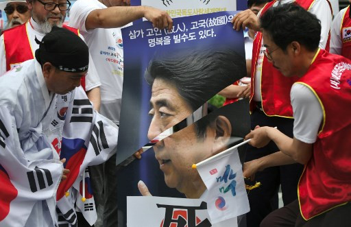 This file photo taken on July 23, 2019 shows South Korean protestors cutting a banner with a picture of Japan's Prime Minister Shinzo Abe during a rally denouncing Japan for its recent trade restrictions against Seoul over wartime slavery disputes, near the Japanese embassy in Seoul. A visceral trade row between Japan and South Korea risks damaging both countries' national interests as their leaders seek to bolster domestic political positions, analysts say.