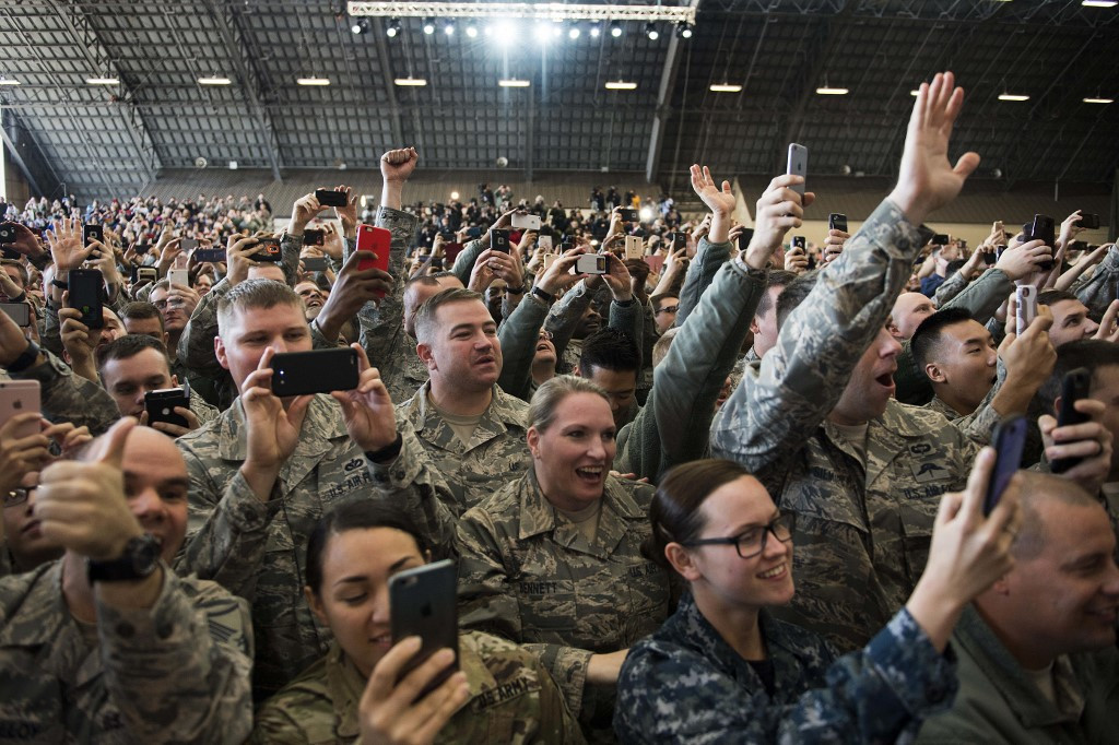 US troops cheer as US President Donald Trump (not pictured) arrives to speak during an event with US military personnel at Yokota Air Base in Tokyo on November 5, 2017. Trump touched down in Japan on November 5, kicking off the first leg of a high-stakes Asia tour set to be dominated by soaring tensions with nuclear-armed North Korea. (Agence France Presse/Jim Watson)
