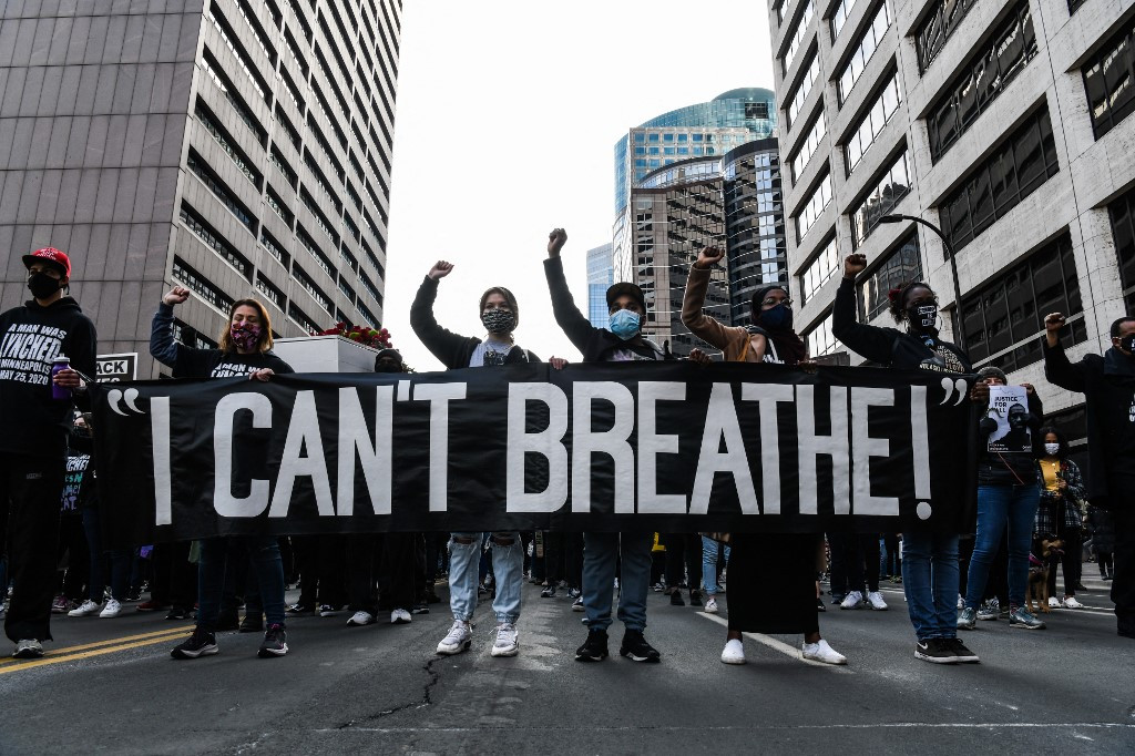 Demonstrators hold a banner during the “I Can’t Breathe - Silent March for Justice” in front of the Hennepin County Government Center on March 7, 2021, where the trial of former Minneapolis police officer Derek Chauvin, charged with murdering African American man George Floyd, will begin on March 8, 2021, in Minneapolis, Minnesota. (Agence France Presse/Chandan Kanna)