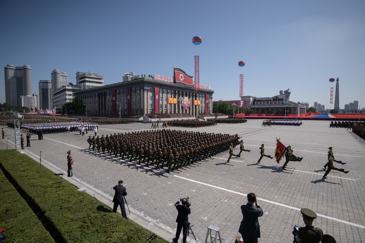 In a file photo taken on Sept.9, 2018 Korean People's Army (KPA) soldiers march during a military parade and mass rally on Kim Il Sung square in Pyongyang. All eyes will be on North Korea on Saturday as it celebrates the 75th birthday of the ruling Workers' Party, with speculation mounting for a (AFP/Ed Jones)