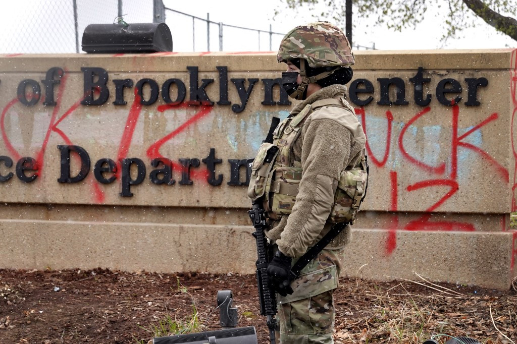 National Guard soldiers stand guard outside of the Brooklyn Center police station on April 13, 2021 in Brooklyn Center, Minnesota. Demonstrators, angry about the fatal shooting of Daunte Wright by a Brooklyn Center police officer, clashed with police for a second night in a row in the suburban Minneapolis community. (AFP/Scott Olson/Getty Images)